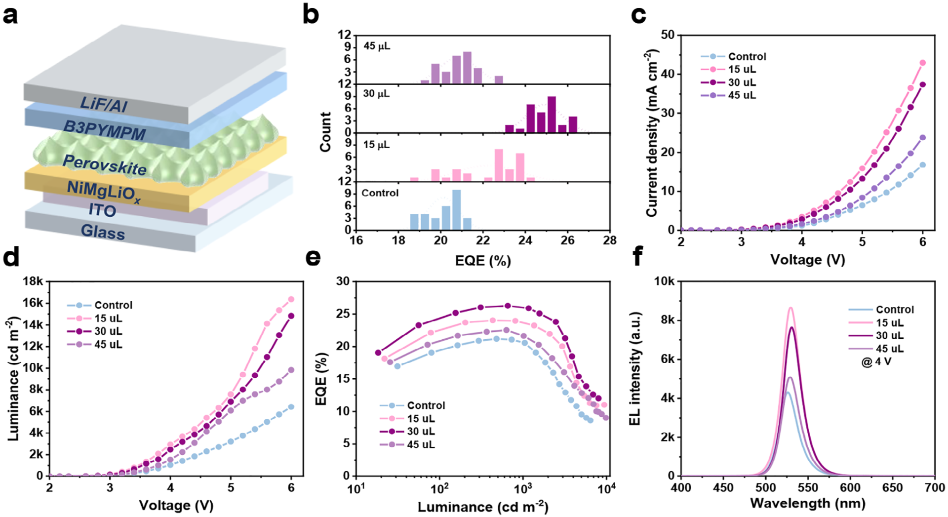 图2. 基于通过一步法和逐步法制备的钙钛矿薄膜的Pero-LEDs的器件结构和工作性能。a) Pero-LEDs器件结构的示意图。b) 30个Pero-LEDs器件的EQEmax直方图。c) Pero-LEDs的J-V(电流-电压)、d) L-V(亮度-电压)和e) EQE-L(外部量子效率-亮度)曲线。f) Pero-LEDs在4V驱动电压下的电致发光(EL)光谱。