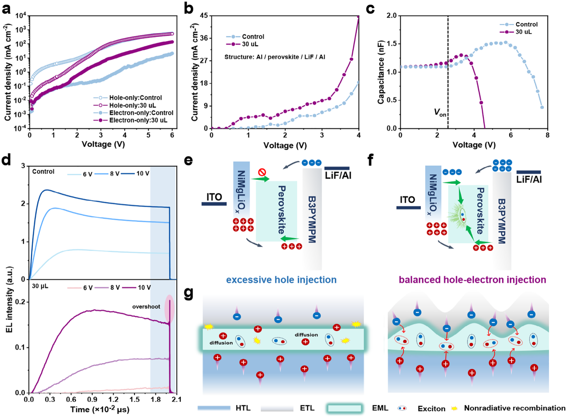 图3. 对照组和30-Pero-薄膜相应的特性表征。a) 单载流子器件的J-V(电流-电压)特性曲线。b) 电子主导注入器件的J-V特性。c) 器件的C-V(电容-电压)曲线。d) 瞬态电致发光(EL)光谱及其相应的机理示意图,分别是 e) 对照组和 f) 30-Pero-LEDs。g) 器件载流子注入和传输行为差异的机理示意图。