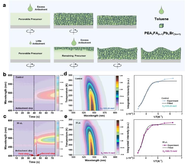 图4. a) 对应不同反溶剂滴加模式的钙钛矿薄膜结晶过程的示意图。b) 对照组-Pero-薄膜和 c) 30-Pero-薄膜结晶过程中的原位光致发光(PL)荧光光谱。d) 对照组-Pero-薄膜和 e) 30-Pero-薄膜在不同温度范围(160–300 K)下的PL光谱的二维彩色图。积分PL强度随温度变化的函数,其中黑线表示非线性拟合。