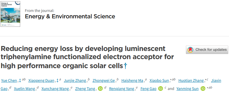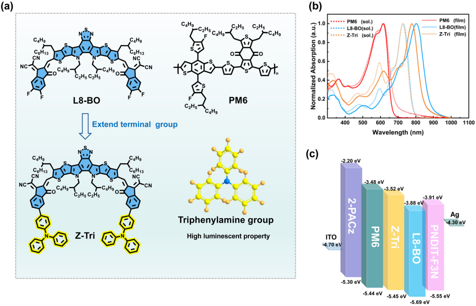 高非辐射复合能量损失(ΔEnr)的持续挑战仍然是提高有机太阳能电池(OSC)功率转换效率(PCE)的关键瓶颈。近日,北京航空航天大学孙晓波、孙艳明、林雪平大学Zhang Huotian通过在末端引入高发光的三苯胺官能团,设计并合成了一种熔融的非富勒烯受体Z-Tri。