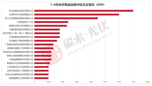 从市场需求看,光伏运维的规模化需求已加速释放。索比光伏网根据公开信息统计,今年1-4月,已公布中标结果的运维项目近48GW。作为光伏电站“大户”的央国企,华能、国能、华润、国家电投、华电等企业的运维需求较高,定标规模均达到GW级,合计规模超40GW。