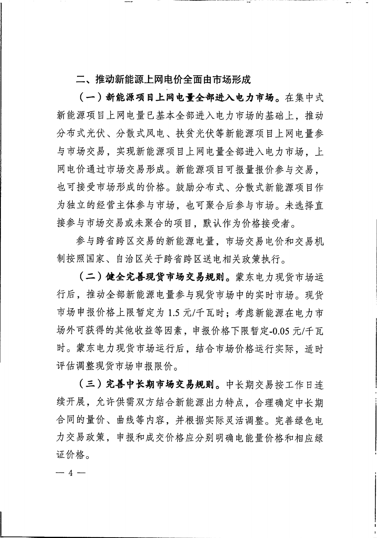 现货市场申报价格上限暂定为1.5元/千瓦时;考虑新能源在电力市场外可获得的其他收益等因素,申报价格下限暂定-0.05元/千瓦时。