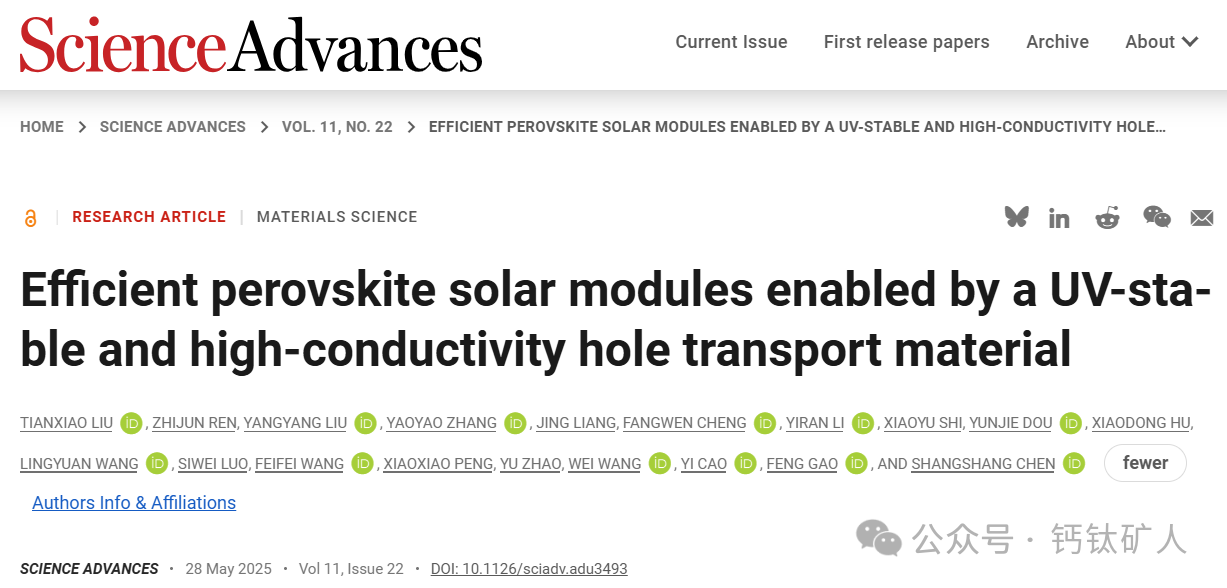 T. Liu, Z. Ren, Y. Liu, Y. Zhang, J. Liang, F. Cheng, Y. Li, X. Shi, Y. Dou, X. Hu, L. Wang, S. Luo, F. Wang, X. Peng, Y. Zhao, W. Wang, Y. Cao, F. Gao, S. Chen, Efficient perovskite solar modules enabled by a UV-stable and high-conductivity hole transport material. Science Advances 11, (2025).