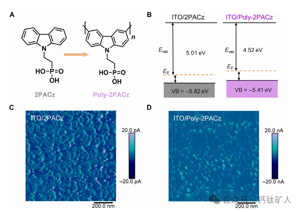 图1. HTL的表征。(A)2PACz和Poly-2PACz的化学结构。(B)通过UPS测量的ITO上的2PACz和Poly-2PACz薄膜的能级。(C和D)被2PACz(C)和Poly-2PACz(D)覆盖的ITO玻璃基板的c-AFM电流图像。