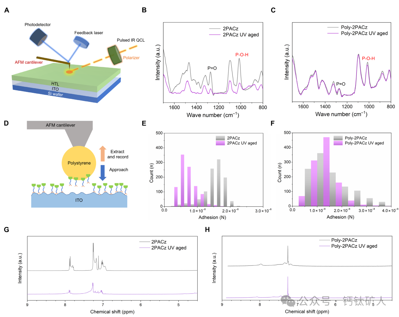图2. HTL的UV稳定性。(A)在涂覆有HTL的Si/ITO晶片上的IR-PiFM测量的示意图。(B和C)在24小时UV照射之前和之后在Si/ITO衬底上的2PACz(B)和Poly-2PACz(C)的IR-PiFM光谱(365 nm,17.0 mW cm-2). a.u.,任意单位。(D)涂有HTL的ITO玻璃基板上的AFM粘附力测量示意图。(E和F)2PACz(E)和Poly-的粘附力分布由AFM粘附力测量确定的24小时UV照射(365 nm,17.0 mW cm-2)之前和之后ITO玻璃基板上的2PACz(F)。(G和H)2PACz(G)和Poly-2PACz(H)在48小时UV照射之前和之后的1H NMR光谱。