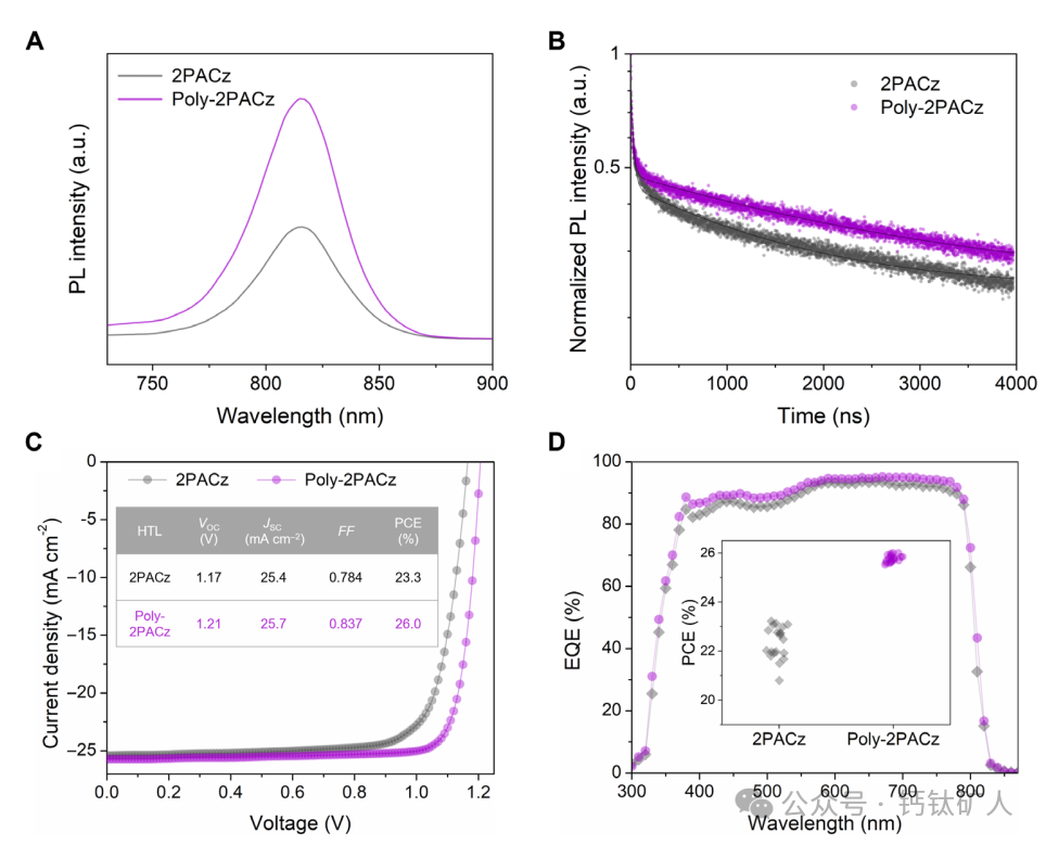 图3. HTL对薄膜PL特性和器件PCE的影响。(A和B)涂覆在2PACz和Poly-2PACz上的钙钛矿膜的稳态PL(A)和TRPL光谱(B)。(C)基于2PACz和Poly-2PACz的冠军PSC的后向J-V特性曲线。插图示出了冠军PSC的光伏参数。(D)基于2PACz和Poly-2PACz的冠军PSC的EQE光谱。