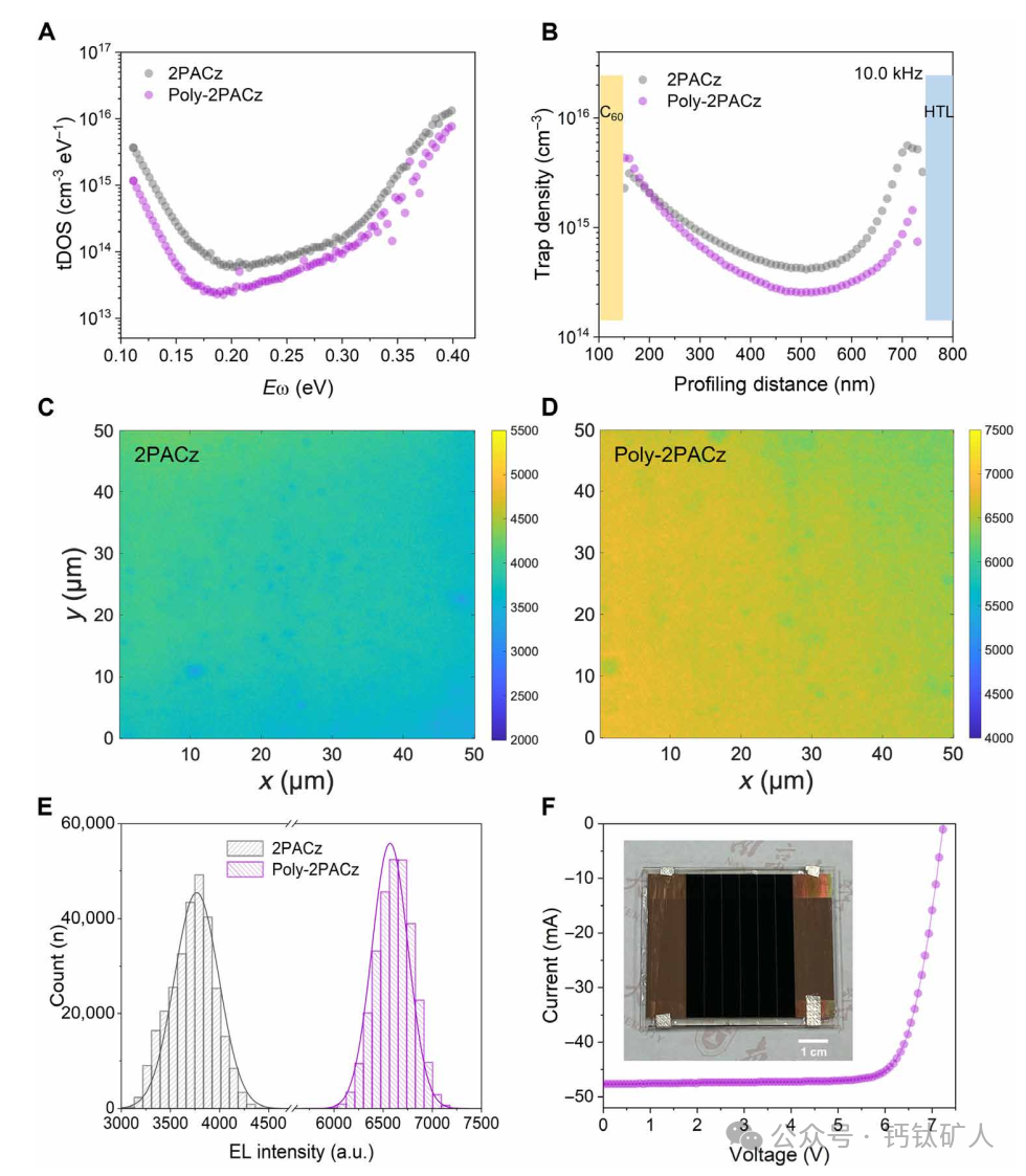 图4. 器件特性.(A至E)tDOS谱(A),DLCP陷阱分布(10.0 kHz,B),EL映射[(C)和(D)],(E)基于2PACz和Poly-2PACz的PSC的EL强度分布。(F)冠军钙钛矿微型模块的I-V曲线插图显示了基于Poly-2PACz的冠军钙钛矿微型模块的照片。