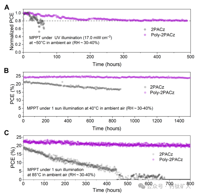 图5. 稳定性研究.(A至C)在365 nm UV灯(17.0 mW cm−2)下在~50°C(A)、在40°C(B)下在1个太阳照射(100 mW cm−2)下和在85°C(C)下在1个太阳照射(100 mW cm−2)下浸泡的封装的PSC的MPP稳定性测试结果.