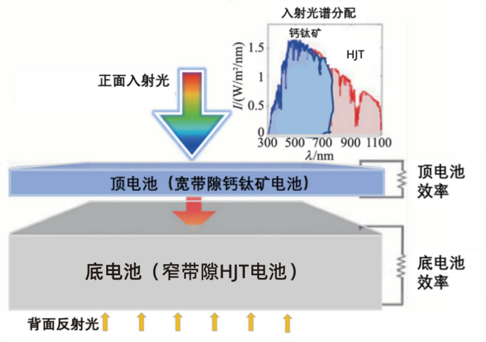 该专利基于一套可靠、安全、低成本、具备可量产性的高效四端叠层工艺,提出了一种新型叠层光伏组件架构。钙钛矿与晶硅电池在光谱响应上各有优势,全光谱转化进一步提高,通过叠层结构协同工作,可实现对太阳能宽谱的高效利用,显著提升光电转换效率。在电路设计上,专利创新性地引入优化的并联汇流与接线方案,降低能量传输损耗,确保钙钛矿与晶硅电池层既能独立输出、又能协同发电,有效提升组件整体的输出稳定性与系统效率。