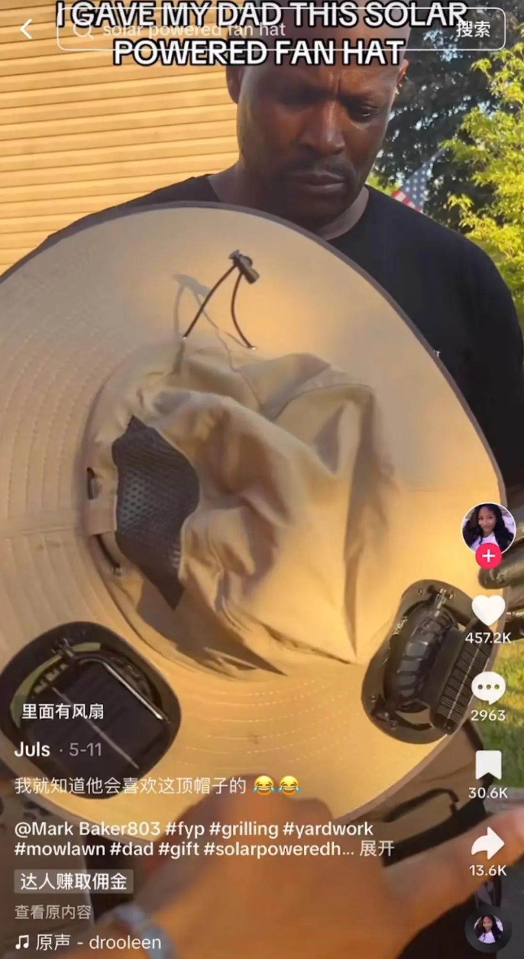 一位美国女性博主在社交媒体上发布了一段父亲节礼物推荐视频,视频播放量超过900万次,引发广泛关注与购买热潮。她在视频中推荐的是一款具备太阳能供电功能的帽子,特别适合户外使用,迅速受到消费者青睐。