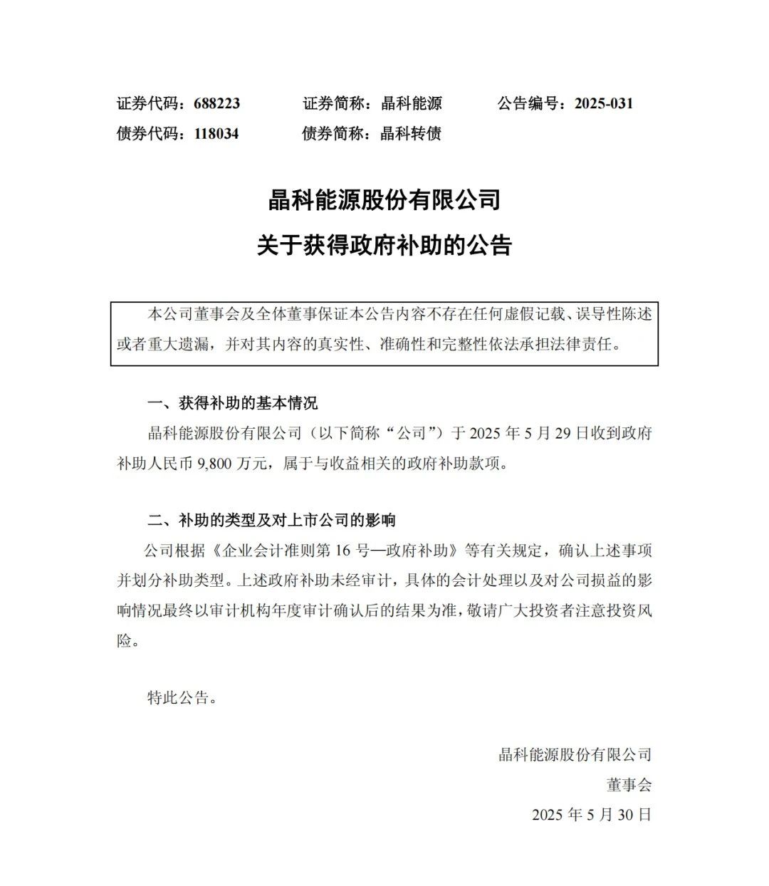 5月30日,晶科能源发布《关于获得政府补助的公告》,宣布公司收到政府补助人民币9800万元,且该笔款项属于与收益相关的政府补助。