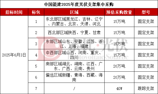 光伏支架分为7个标段,预计采购100万吨固定支架以及4GW跟踪支架,详情如下: