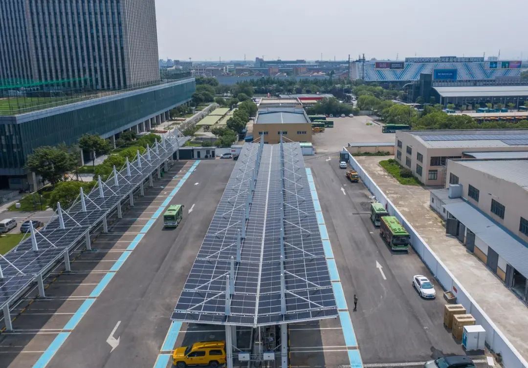 5月27日拍摄的湖州长兴公交总站光储充一体化公交充电站(无人机照片)。