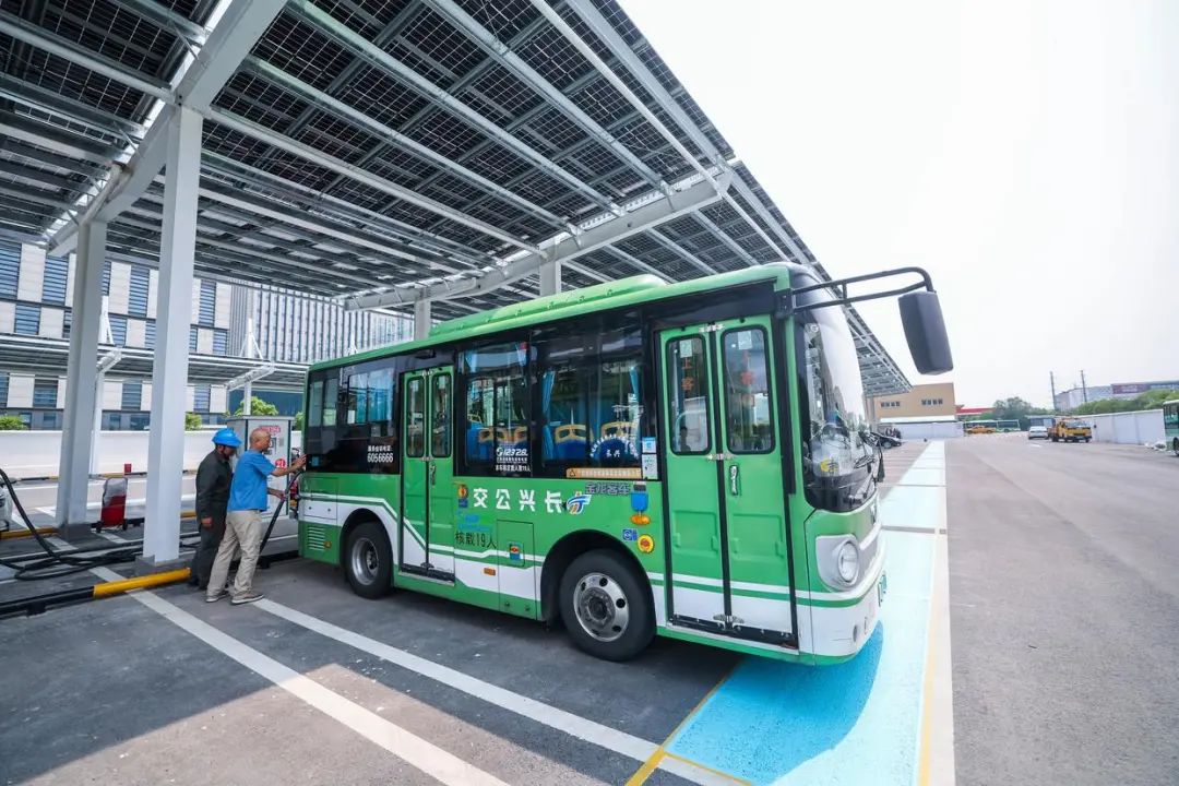 5月27日,在湖州长兴公交总站光储充一体化公交充电站,公交车回站充电。公交车充电一次需要40分钟,能续航200多公里。
