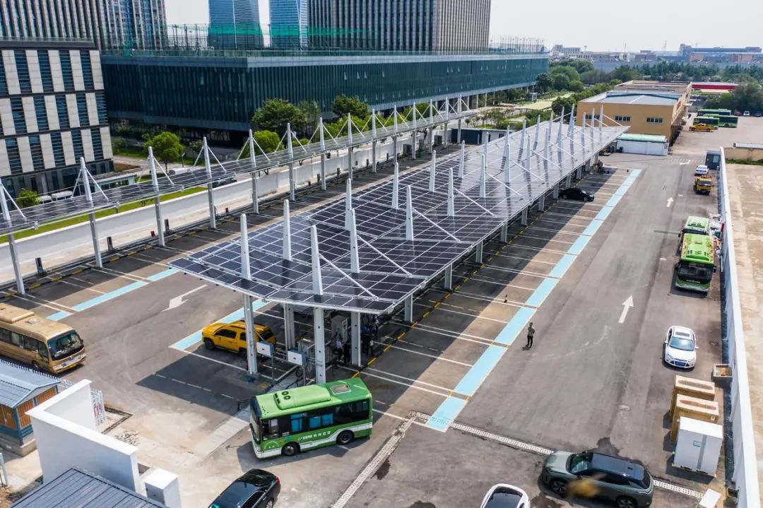 5月27日拍摄的湖州长兴公交总站光储充一体化公交充电站(无人机照片)。新华社记者 徐昱 摄