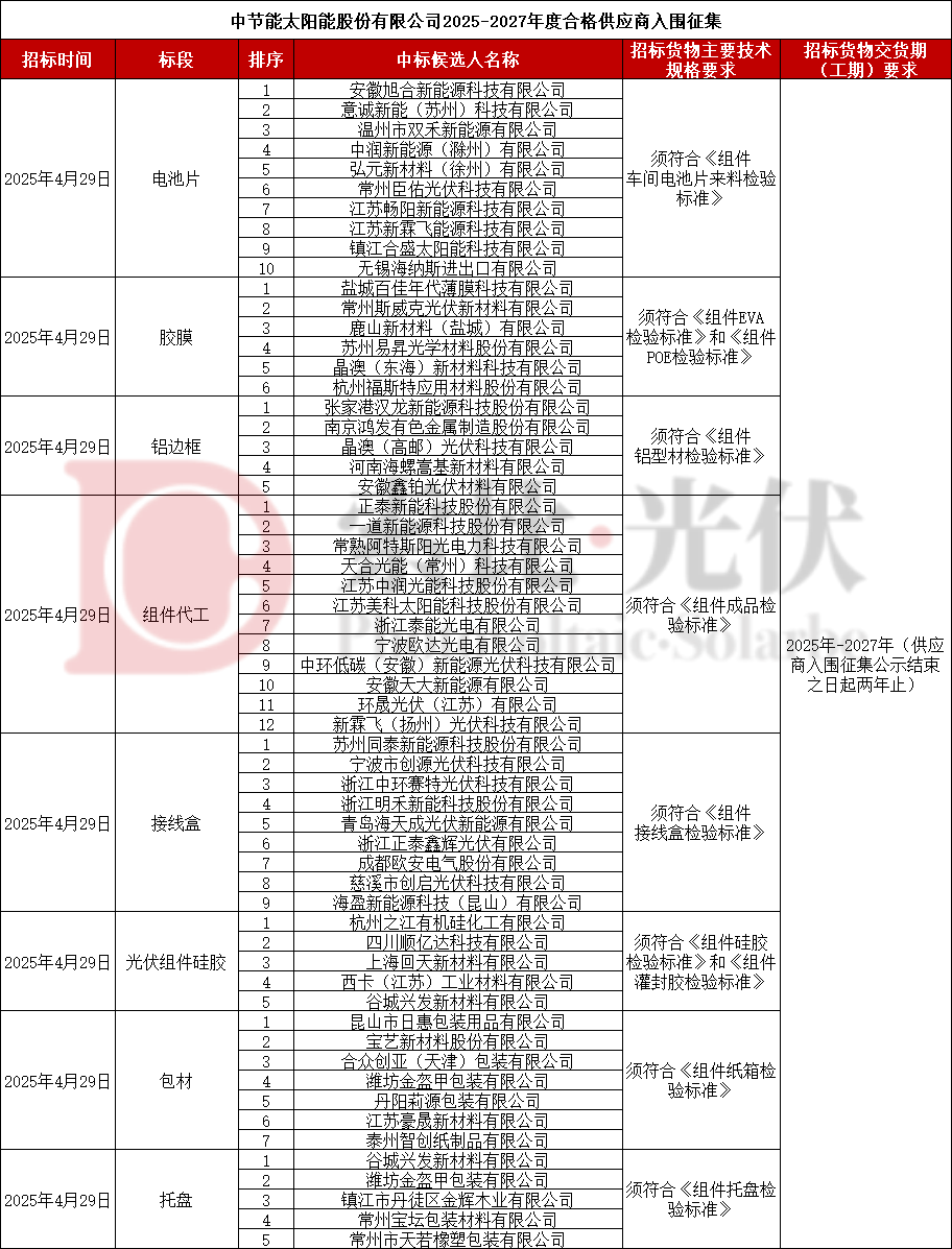 6月3日,中节能太阳能股份有限公司2025-2027年度电池片、胶膜、铝边框、组件代工、接线盒、光伏组件硅胶、包材、托盘合格供应商入围征集中标候选人公示,共有59家企业入围,招标货物交货期在2025年-2027年(供应商入围征集公示结束之日起两年止),入围详情如下: