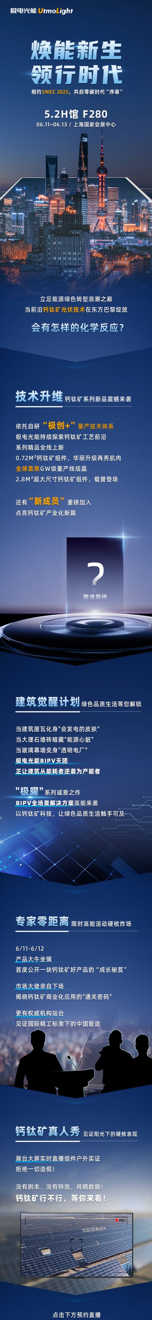 而极电光能,正以钙钛矿为笔,在这部以全新视角解读“中国智造”的影像册中书写关于绿能未来的关键篇章。此次极电光能亮相央视《工业巨好看》节目,不仅展示了公司在能源新材料领域研发创新的硬核实力,更彰显出极电钙钛矿技术成果的产业价值与示范意义。未来,极电光能将持续深耕钙钛矿塔尖技术,聚焦技术创新与产业化实践,为全球能源转型和绿色能源可持续发展贡献更多“极电”力量。