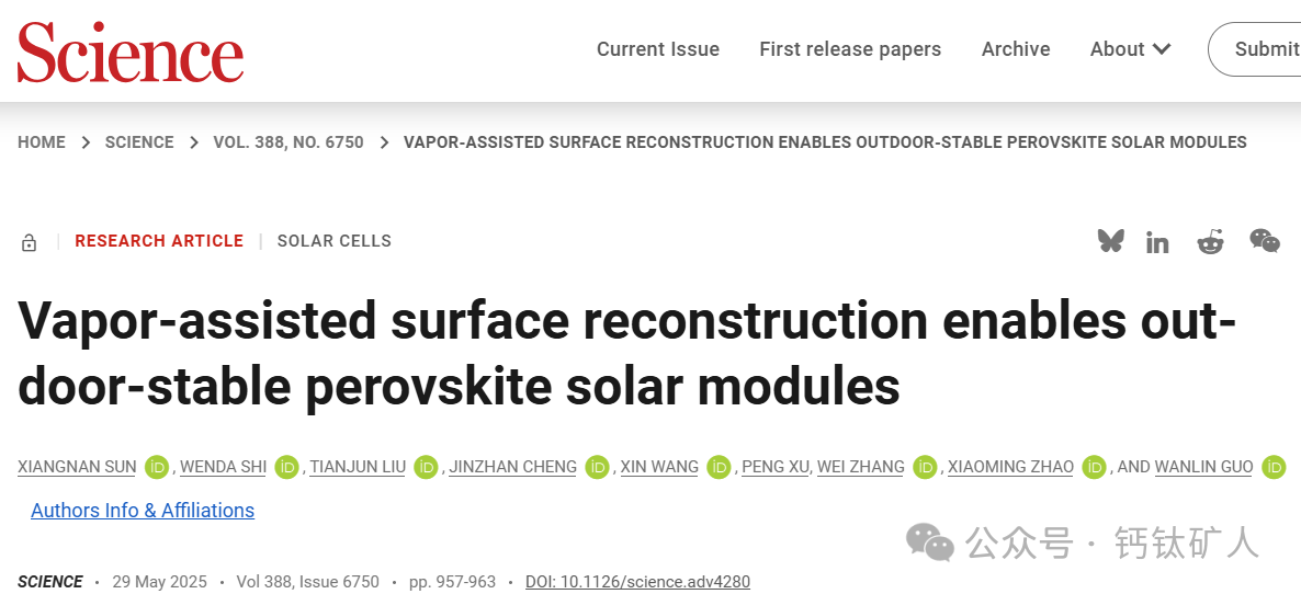 该研究专注于通过蒸汽辅助表面重建技术来改善钙钛矿太阳能组件的性能。科研团队通过精确控制蒸汽处理过程,优化了钙钛矿材料的表面结构,从而提高了组件的光电性能和户外稳定性。