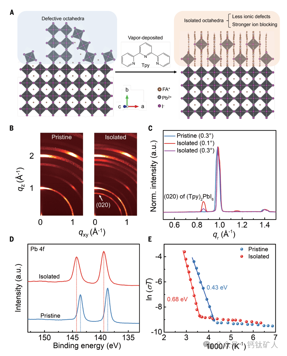 图1. 钙钛矿表面八面体分离。(A)表面八面体分离的示意图。(B)FAPbI 3膜的GIWAXS图案(“原始”)和用Tpy处理的FAPbI3膜(“隔离”)以0.10°入射角拍摄(C)以0.10°入射角在原始和孤立样品上收集的方位积分GIWAXS迹线(D)XPS Pb 4f光谱和(E)原始膜和分离膜的温度依赖性电导率。