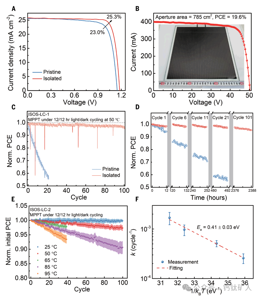 图2. 器件性能和稳定性。(A)0.16-cm 2原始和隔离太阳能电池的J-V特性。(B)具有785 cm 2孔径面积的冠军太阳能模块的I-V特性。(C)归一化PCE和(D)在12小时光照下操作的包封的原始和分离的PSM的选定循环。在50 ℃下进行暗循环。数据点来自于每种条件下的一个代表性装置。(F)从PCE降解的线性拟合获得的降解速率k与1/kBT,其中T是老化温度,kB是玻尔兹曼常数。