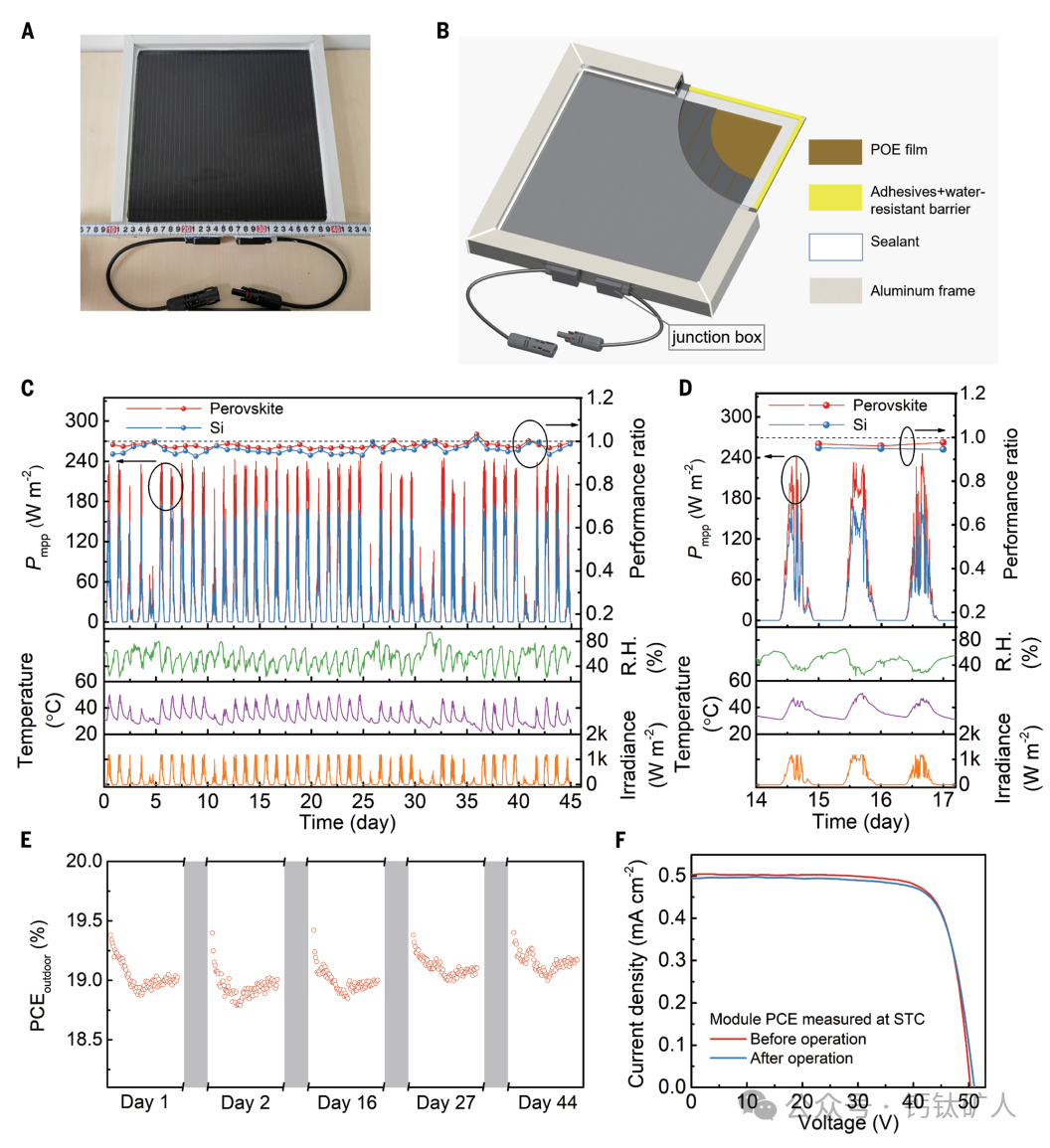 图3. 长期室外稳定性。(A)封装的785-cm 2模块的照片。(B)封装的示意图。(C)封装PSM和Si参考电池在实际条件下的室外功率输出(ISO-O-2),包括PR值。这里的温度是指测量的模块温度。(D)连续3天的选定数据。(E)钙钛矿模块的PCE户外5天的日变化,从上午7点到下午7点记录。(F)PSM在户外运行45天之前和之后的J-V特性。PCE测量在STC下进行。