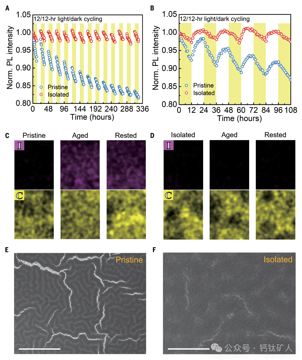 图4. 降解机制。(A)原始和分离的钙钛矿膜的归一化PL强度随时间的变化。将样品在氮气气氛中在50 ℃下在12/12小时光-暗循环下老化。(B)原始和分离的钙钛矿膜的四个循环的PL降解和恢复动力学。(C和D)STEM-新鲜、老化(在50°C下12/12小时光-暗循环的60个循环)和静置(在50 ° C下在黑暗中12小时)的(C)原始和(D)分离的器件的ETL层中的EDX绘图。(E和F)静置的(E)原始和(F)分离的器件的ETL层上的SEM图像。