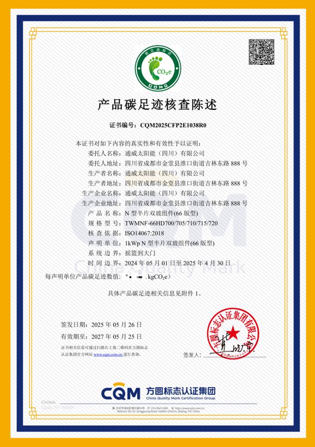 近日,通威太阳能科技金堂基地荣获方圆标志认证集团四川有限公司颁发的N型半片双玻组件66版型(TWMNF-66HD***)产品碳足迹核查证书。这标志着金堂基地在减少碳排放、引领行业绿色转型方面迈出关键一步。