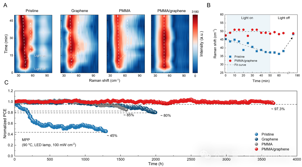 团队通过聚甲基丙烯酸甲酯(PMMA)将单层石墨烯与钙钛矿薄膜结合,形成机械增强界面: