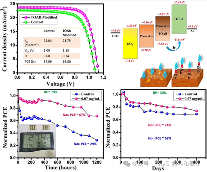 此外,发现TOAB涂层器件具有出色的保质期,在30% 相对湿度(RH)条件下在空气中黑暗储存300天后仍保留其初始PCE的80% 以上,400 天后保留约74%的初始PCE。
