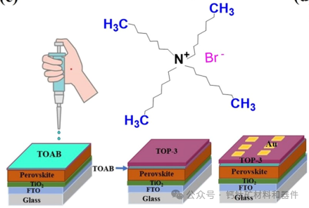TOAB通过钝化陷阱态、赋予疏水性、减少钙钛矿和TOP-3空穴传输层(HTL)之间的能量失配以及通过与HTL的相互作用促进高效空穴提取而起到多功能试剂的作用。