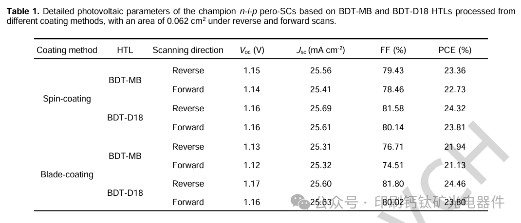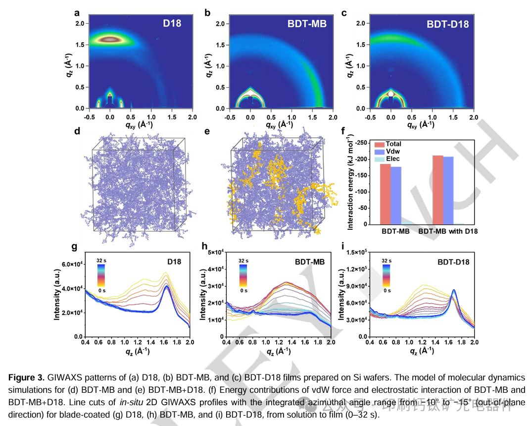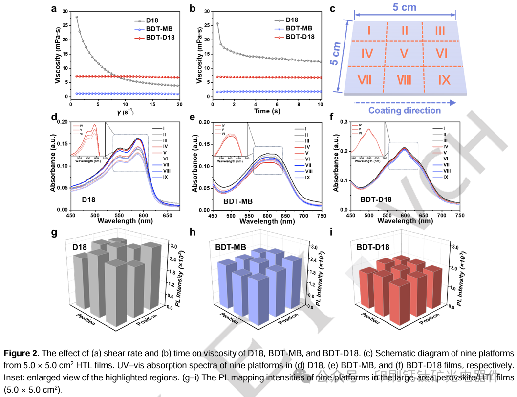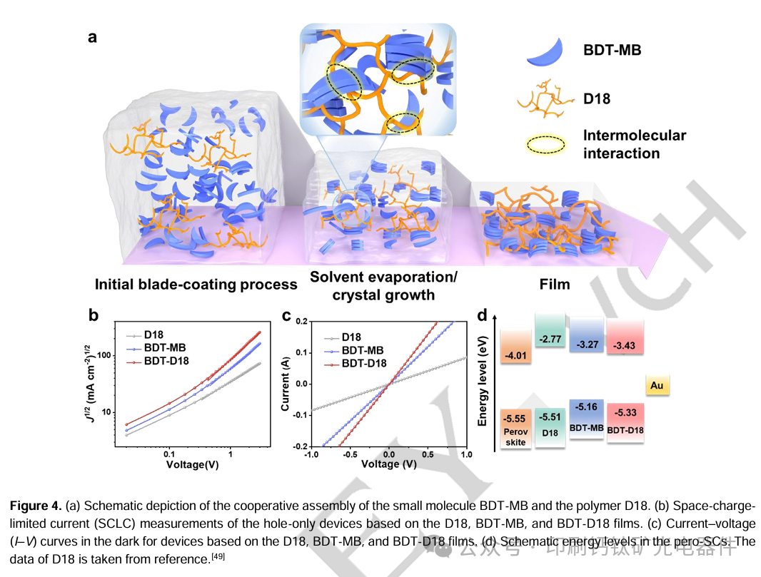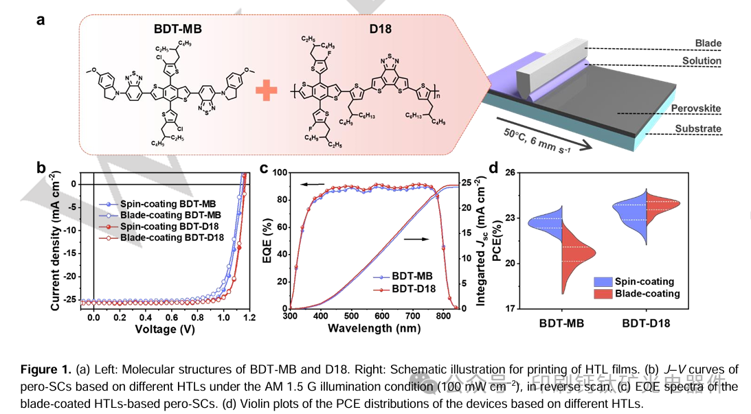 提出了一种新型的分子协同策略,通过将高迁移率小分子BDT-MB与预聚集聚合物D18结合,利用D18作为“种子晶体”诱导BDT-MB的有序面内取向,并通过分子间C-H···π相互作用调控溶液粘度。这一策略解决了传统小分子HTL在印刷过程中易聚集和分布不均的问题,实现了均匀、致密的纤维状HTL薄膜形貌。