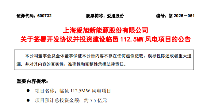 6月4日,爱旭股份公告,公司拟与临邑县人民政府签署《临邑县中部风电项目资源开发协议书》,计划总投资约7.5亿元,在临邑县投资建设临邑112.5MW风电项目,项目实施主体为临邑志珩新能源有限公司,项目建设周期预计 12 个月,一次性建成后计划于2027年建成并网。