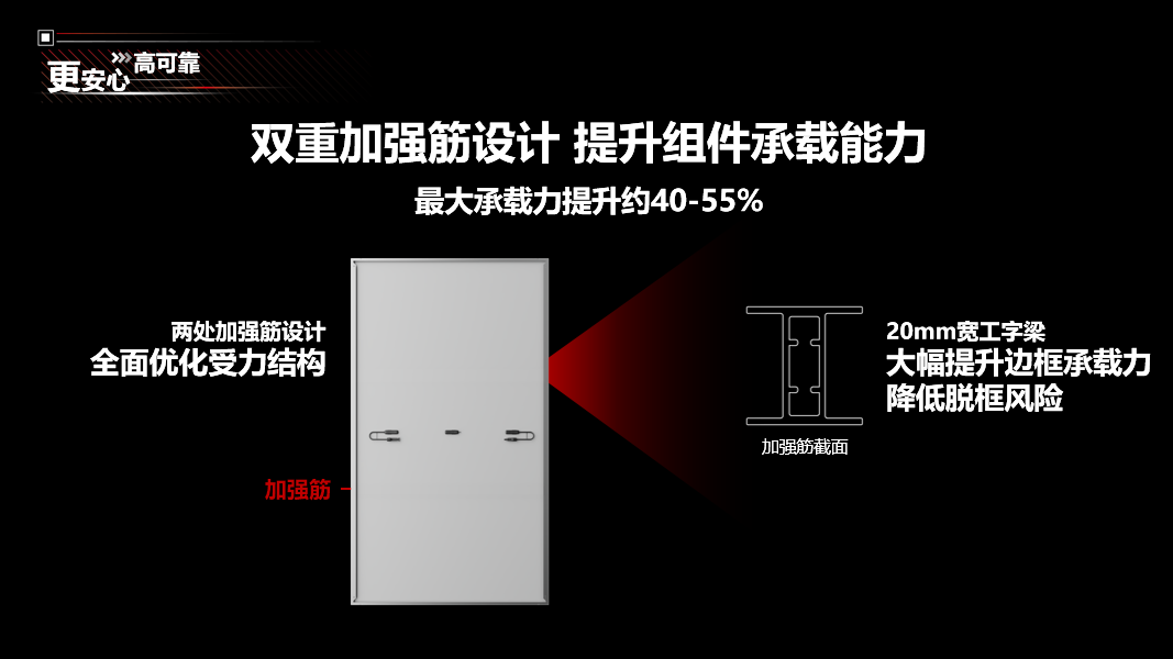 牛燕燕表示,隆基Hi-MO X10轻质双防组件在背面结构中增加了工字形加强筋,形成高效力学分布,组件最大承载力提升50%以上,正面可承受最大3600Pa及背面2400Pa的载荷,相当于可抵御3.6米厚的新雪和12级大风。同时,组件边框厚度增加5%,即使碰到强风、积雪等极端天气,也能有效抑制边框扭曲变形。“我们在实验室做了冰雹测试,30毫米直径的冰雹以23m/s的速度砸在这款组件上,不会出现玻璃破碎、隐裂的情况。”牛燕燕说。