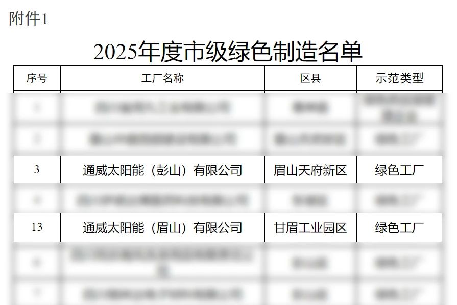 近日,眉山市经济和信息化局公示了2025年度市级绿色制造名单,通威太阳能(眉山)有限公司、通威太阳能(彭山)有限公司荣列其中,荣获“眉山市绿色工厂”荣誉称号。