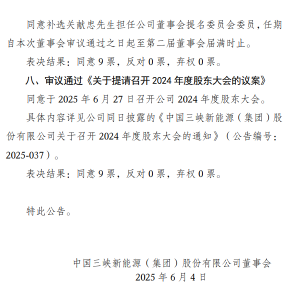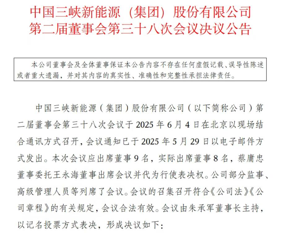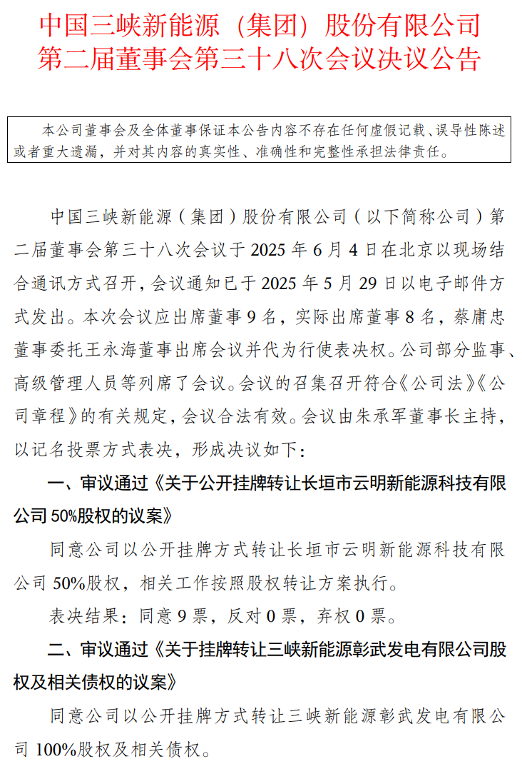 6月4日,三峡能源召开董事会,审议并通过了两项重要议案,同意公司以公开挂牌方式转让长垣市云明新能源科技有限公司50%股权,以及三峡新能源彰武发电有限公司100%股权及相关债权。