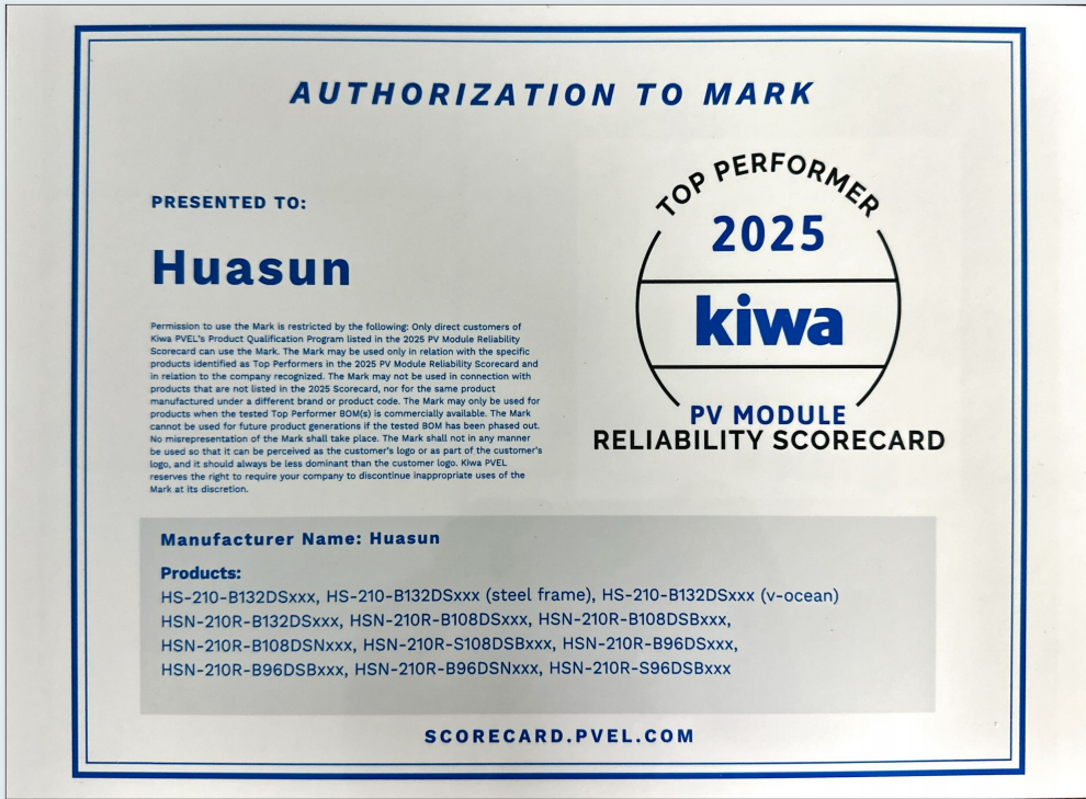 在光伏产业加速迈向“高质量发展”的关键节点,华晟新能源再获国际权威认可——6月4日,全球光伏组件可靠性测评权威机构Kiwa PV Evolution Labs(Kiwa PVEL)发布“2025光伏组件可靠性记分卡”。华晟凭借喜马拉雅系列G12-132版型组件、珠峰系列组件的卓越表现,连续第三年获得“Top Performer”殊荣,这不仅彰显了华晟异质结组件在可靠性与性能方面的卓越品质,更是对华晟在光伏技术研发与生产制造领域领先地位的高度认可。