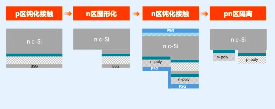 在过去,传统的两步法需要外源性掩膜,导致工序流程长、过程污染严重,在规模量产中效率、良率、成本均难以取得突破,因此行业普遍采用一步法制备BC电池的p、n区隧穿氧化层和多晶硅层,即在整面沉积基础膜层后,再通过局部覆盖掺杂源进行高温退火实现掺杂。这种方法虽工序相对简洁,但存在根本性局限:p型区和n型区对隧穿层厚度、质量及掺杂工艺的要求存在显著差异,“一刀切”的工艺导致钝化接触性能只能折中妥协,无法各自达到最优。