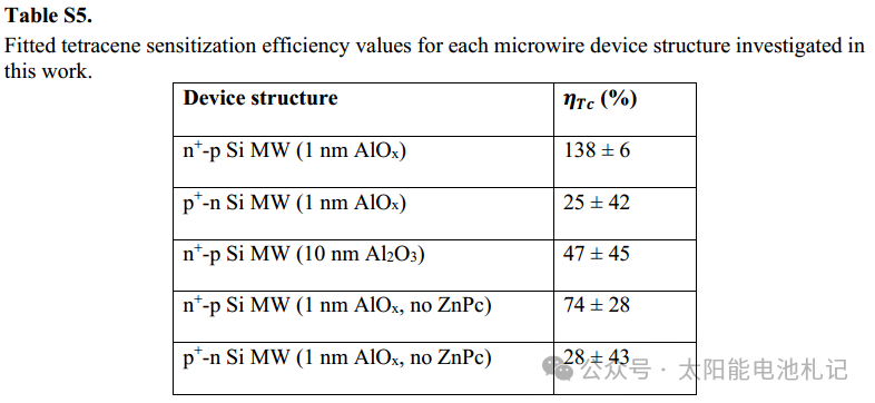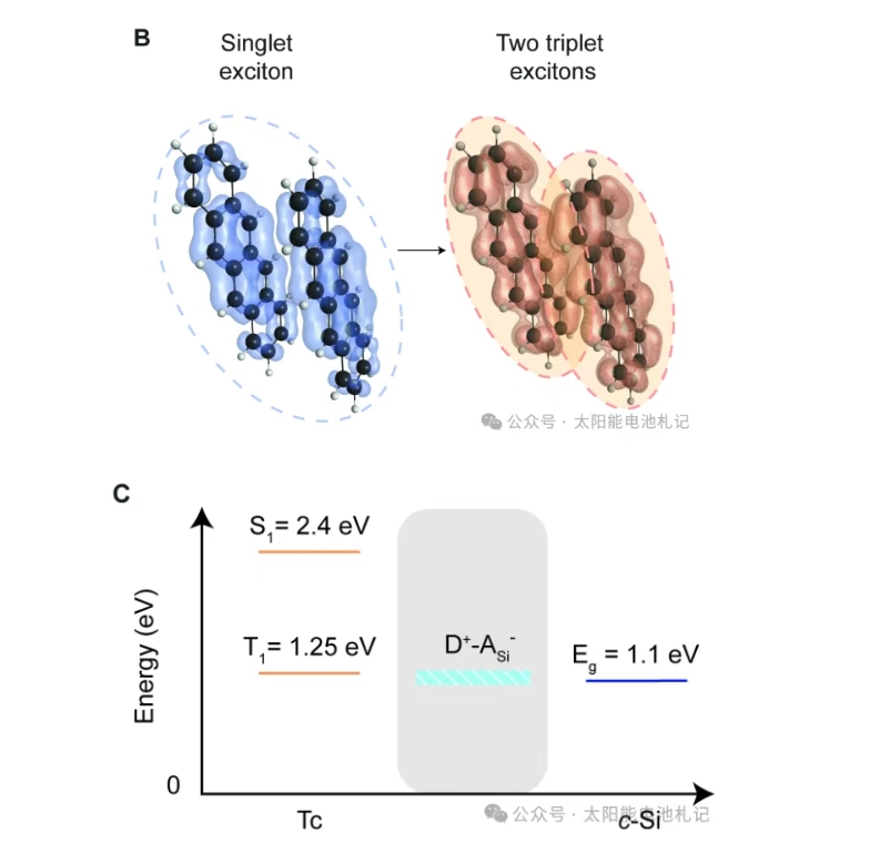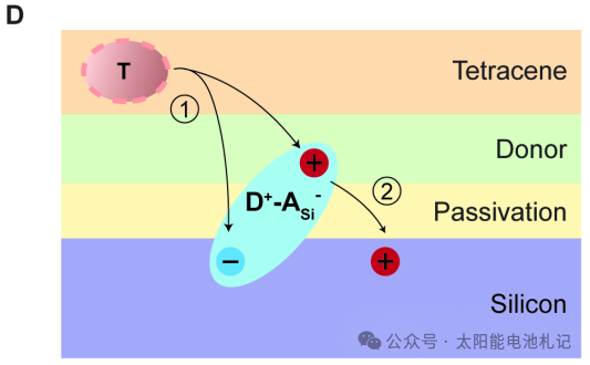 能量传递完成: 通过这样先电子、后空穴的顺序转移过程,一个四并苯三重态激子的能量被高效地转换成了硅电池中的一个额外电子-空穴对。
