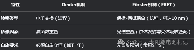 自旋守恒:由于涉及电子交换,Dexter转移必须遵守自旋选择定则,因此特别适合三重态-三重态(T1→T1)能量转移。