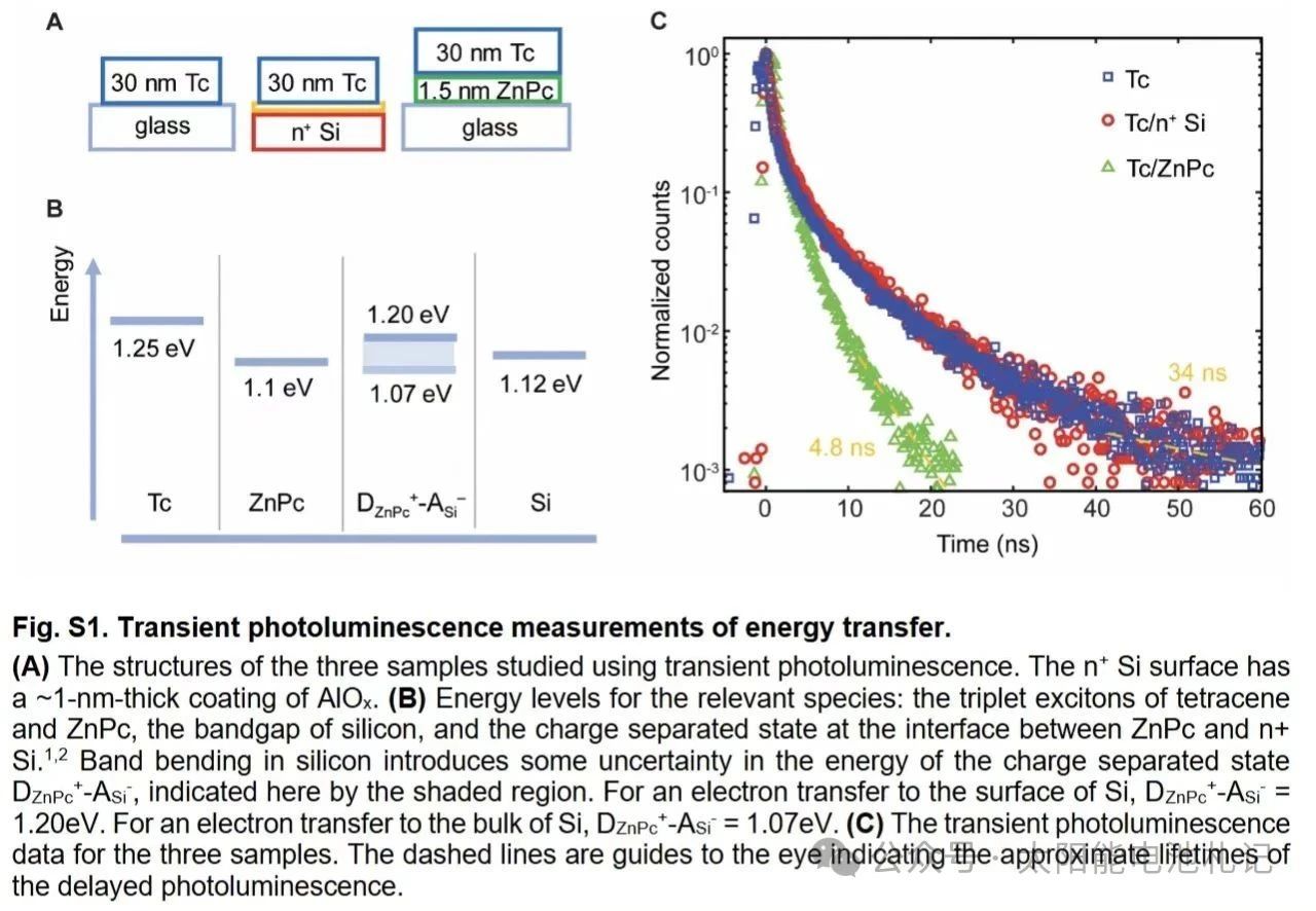 MIT的颠覆性方案:顺序电荷转移与“三明治”界面研究团队提出了一个革命性的方案:顺序电荷转移机制和创新的双层界面结构,成功解决了能量传递难题:关键中间层 - 酞菁锌(ZnPc):在四并苯和硅之间插入一层极薄(约1.5 nm)的ZnPc分子层:作用一(能量梯子): ZnPc的最高占据分子轨道(HOMO)能级比四并苯高约0.2 eV。引入ZnPc作为电子给体,其HOMO能级高于Tc,可在硅表面形成中间电荷分离态(D⁺-Asi-),该态的能量(约1.20 eV)正好位于四并苯三重态能量(1.25 eV)和硅带隙(1.1 eV)之间,为能量传递架设了“梯子”。
