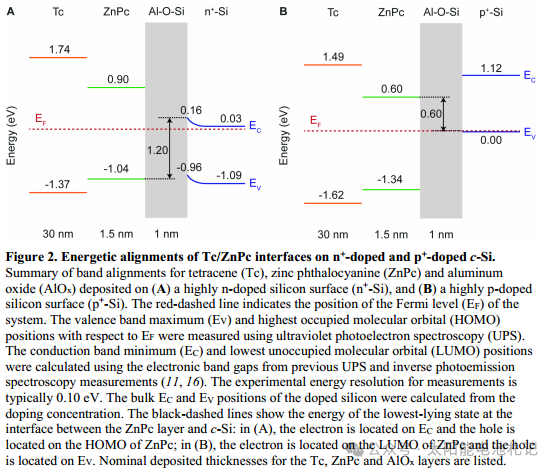 通过紫外光电子能谱(UPS)测量,团队发现ZnPc在n-Si表面的能级排列完美支持电荷转移,而在p-Si中则存在电子转移势垒。这解释了为何n-p型器件表现优异,而p-n型器件效率下降。