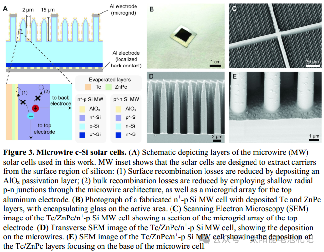 为了高效收集界面处产生的电荷(主要是少数载流子),团队采用了浅结径向PN结硅微线(Microwire,MW)太阳能电池设计: