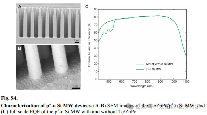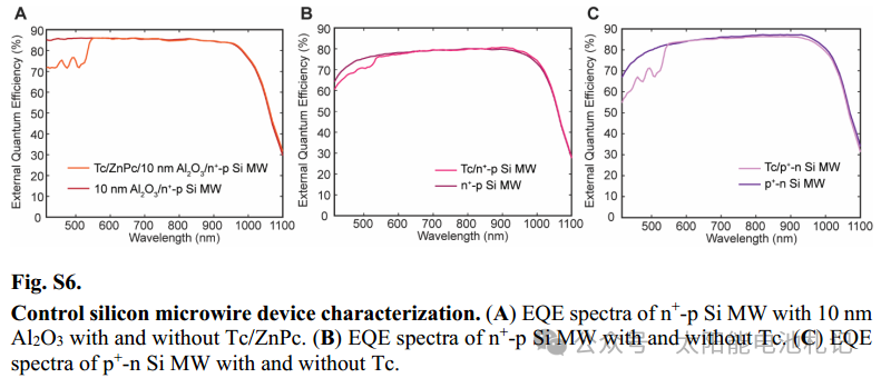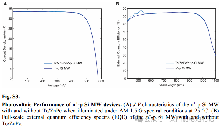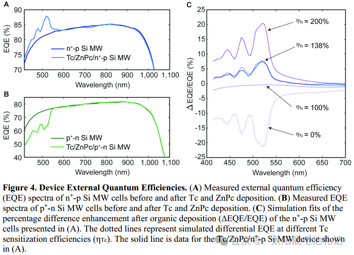 对照实验(p⁺-n型电池)在沉积Tc/ZnPc后,EQE因有机层吸收而下降,证明增益非抗反射效应所致
