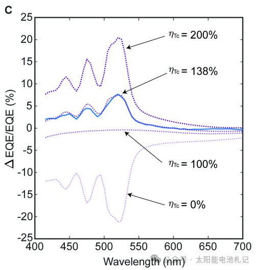 138%的峰值电荷生成效率: 通过严格的光学模型和实验数据拟合,团队计算出在520 nm处,每吸收一个光子,在硅中产生的电荷(电子)对应的效率高达(138±6)%!这明确证实了每个被四并苯吸收的高能光子,通过激子裂变和高效的顺序转移,产生了超过一个(平均约1.38个)可被硅电池利用的电子。这是首次在硅基太阳能电池中实验观测到量子效率超过100%。