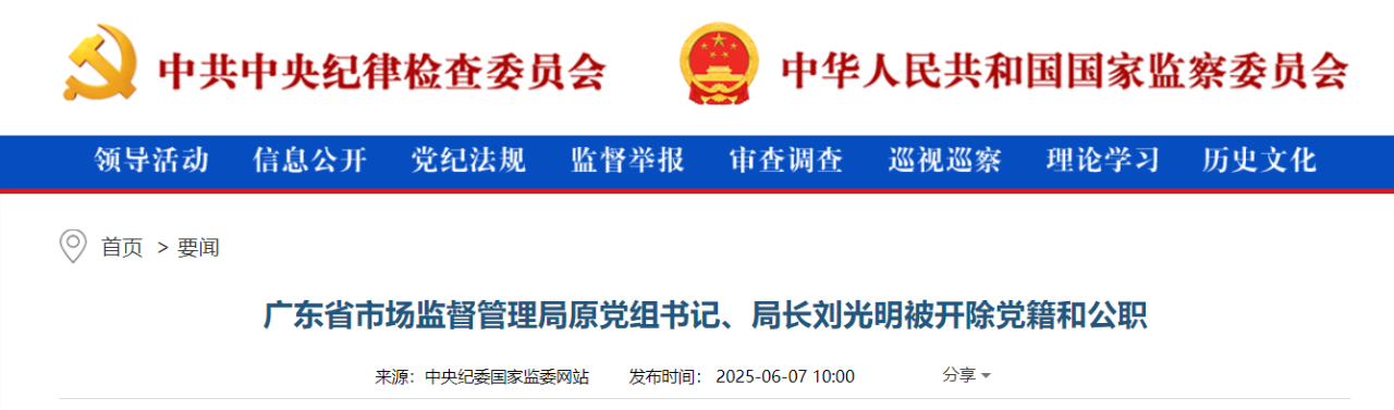中央纪委国家监委网站6月7日消息,据广东省纪委监委消息:经广东省委批准,广东省纪委监委对第十三届广东省委委员,广东省市场监督管理局原党组书记、局长刘光明严重违纪违法问题进行了立案审查调查。