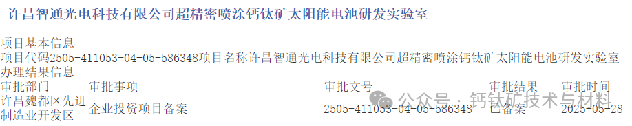 近日,许昌智通光电科技有限公司超精密喷涂钙钛矿太阳能电池研发实验室发布项目备案公告。