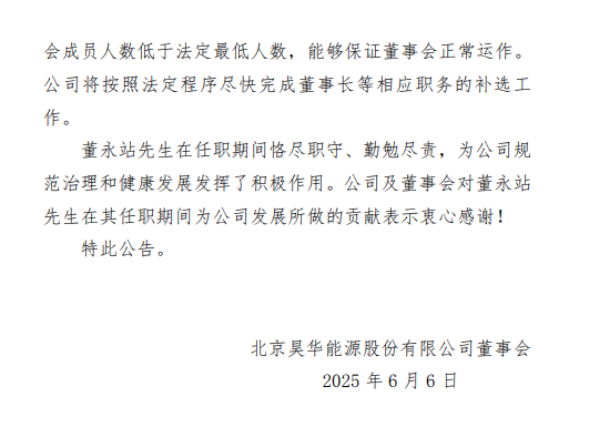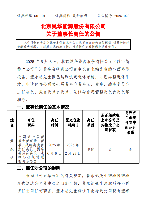昊华能源发布公告称,6月6日,公司董事会收到公司董事长董永站先生的书面辞职报告,董永站先生因已达到法定退休年龄,并已办理退休手续,申请辞去公司第七届董事会董事长、董事、战略委员会主任委员、提名委员会委员、法律与合规管理委员会委员等职务。