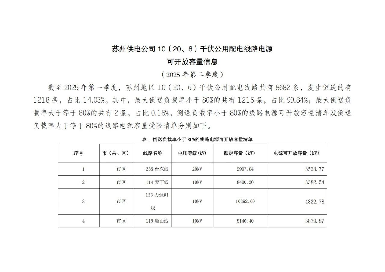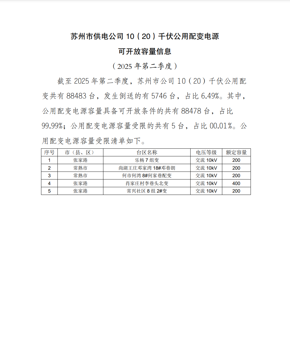 根据《国家能源局关于印发<分布式光伏发电开发建设管理办法>的通知》(国能发新能规〔2025〕7号)、《关于贯彻落实<分布式光伏开发建设管理办法>的实施意见》(苏发改规发〔2025〕2号)要求,市发展改革委组织国网苏州供电公司动态测算全市电网承载能力,全面评估全市分布式光伏可开放容量,现将评估结果(数据截止到2025年第一季度)向社会公开。