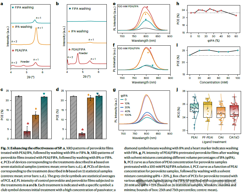 表面缺陷钝化对于提高钙钛矿太阳能电池的效率和稳定性至关重要。然而,其可重复性和普遍适用性尚未得到充分探索,限制了大规模生产。鉴于此,西湖大学王睿&浙江大学薛晶晶在期刊《Nature Energy》发文,题为“Fluorinated isopropanol for improved defect passivation and reproducibility in perovskite solar cells”。在这里,介绍了一种基于氟化异丙醇的钝化策略,只需一层薄薄的低维钙钛矿即可完全钝化表面缺陷,而不会干扰电荷传输。氟化异丙醇可降低钝化剂分子与钙钛矿的反应性,并允许使用高浓度的钝化剂,确保完全缺陷钝化。随后用氟化异丙醇和异丙醇的溶剂混合物冲洗,去除多余的钝化剂分子。证明该策略具有广泛的加工窗口,对钝化器浓度的偏差具有很高的容忍度,适用于各种器件架构、钙钛矿成分和器件领域。这种方法可实现高功率转换效率,并有可能提高工业制造的可扩展性和产量。