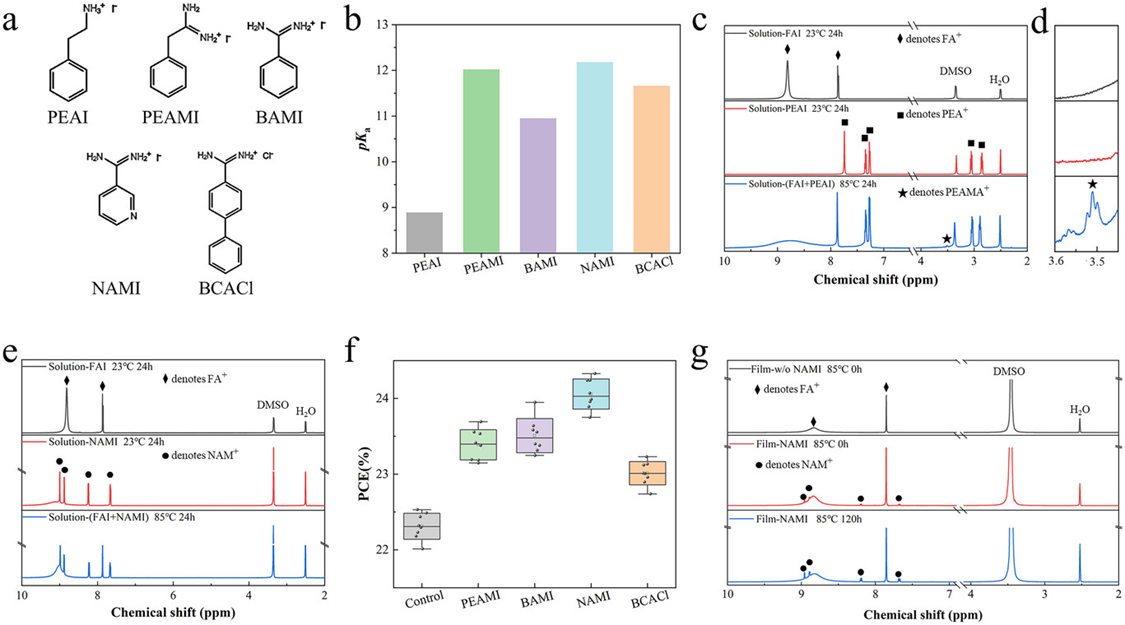 (简单说,铵基阳离子高温脱质子,产物胺与FA+反应释放氨气;酸解离常数pKa决定脱质子能力,所以要寻求高pKa值的钝化剂,脒基被证明更高,有望实现高效又稳定)